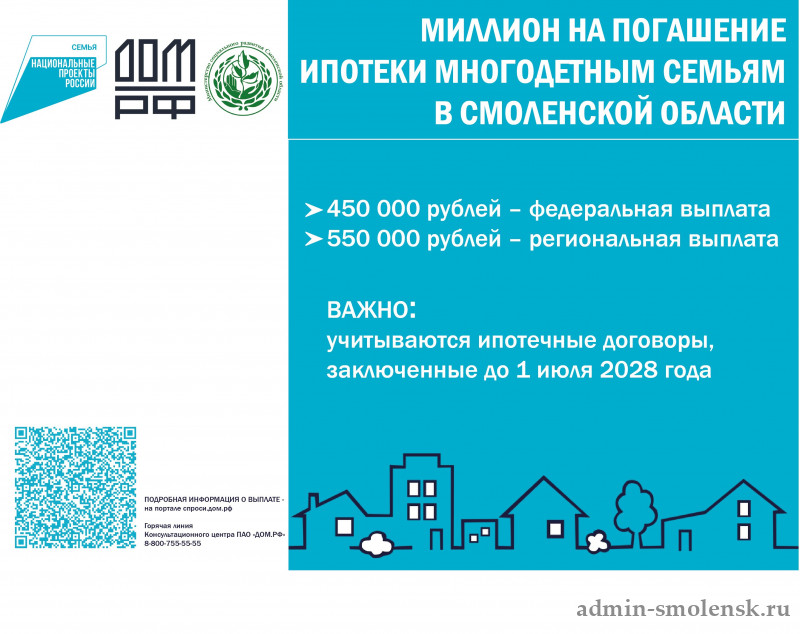 1. В рамках нацпроекта «Семья» на территории Смоленской области предоставляется выплата на полное или частичное погашение обязательств по ипотечному жилищному кредиту.